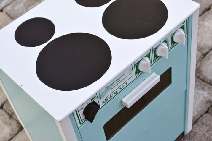 Det första jag tog tag i, i och med lekstugans renovering, var den gamla leksaksspisen från Micki. Den fick jag och min bror när vi var små och sedan dess har det lekts en hel del med den. Kanske kan man då förstå att den med all rätt varit lite "sliten" de senaste åren. Nu var spisen både skavd och vinglig. Dessutom saknades en masonitskiva inuti ugnen, så lilla L har fått ställa in alla grejer som bakats i ugnen direkt på golvet. Kanske kunde man tycka att den gjort sitt?