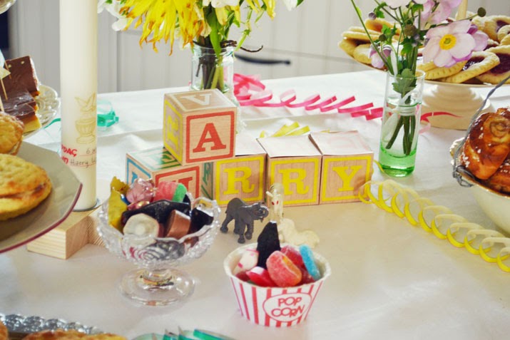 Cirkustema blev det. Både på dukning och kakor. (Ni får ursäkta de lite halvtaskiga bilderna, Tiden var knapp och jag hann med nöd och näppe fota dukningen lite snabbt i förväg. Och stenarna ni ser på bilderna hör såklart inte till dukningen, de håller pappersdukarna tillfälligt på plats. Så att de inte skulle blåsa iväg..) Färgerna jag hade beslutat mig för till cirkustemat var framförallt; mintgrönt, ljusgult och rött (och en liten touch av ljusturkos). På Pinterest hittade jag en gratis mall på fina träklossar att skriva ut på papper. Dessa skrev jag ut, vek och klistrade ihop så att det blev små bokstavsklossar. Alla bokstäver fanns inte, men som tur var kunde jag lyckas få till HARRY, namnet som lillkillen blev döpt till. Dessa klossar använde jag sedan till bordsdekoration, både på kakbordet och där gästerna satt. Jag hade även hittar små cupcakewrappers-mallar på Pinterest som jag satte runt några muffinsformar som fylldes med plockgodis. Jag hade vikt cirkustält av gamla böcker (beskrivning på hur du gör ett sådant kommer i ett annat inlägg!) som fick agera bordsdekorationer tillsammans med små vaser och gamla små plastdjur i ren cirkusanda. Några av de randiga mintgröna servetterna använde jag som smådukar under vaserna. Såklart var både kakor och tårtor lite cirkus inspirerade de med.